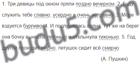 1. Три девицы под окном пряли поздно вечерком. 2. Буду служить тебе славно, усердно и очень исправно. 3. Море вздувается бурливо. 4. И послушалась волна: тут же на берег она бочку вынесла легонько и отхлынула тихонько. 5. Год, другой проходит мирно, петушок сидит всё смирно.